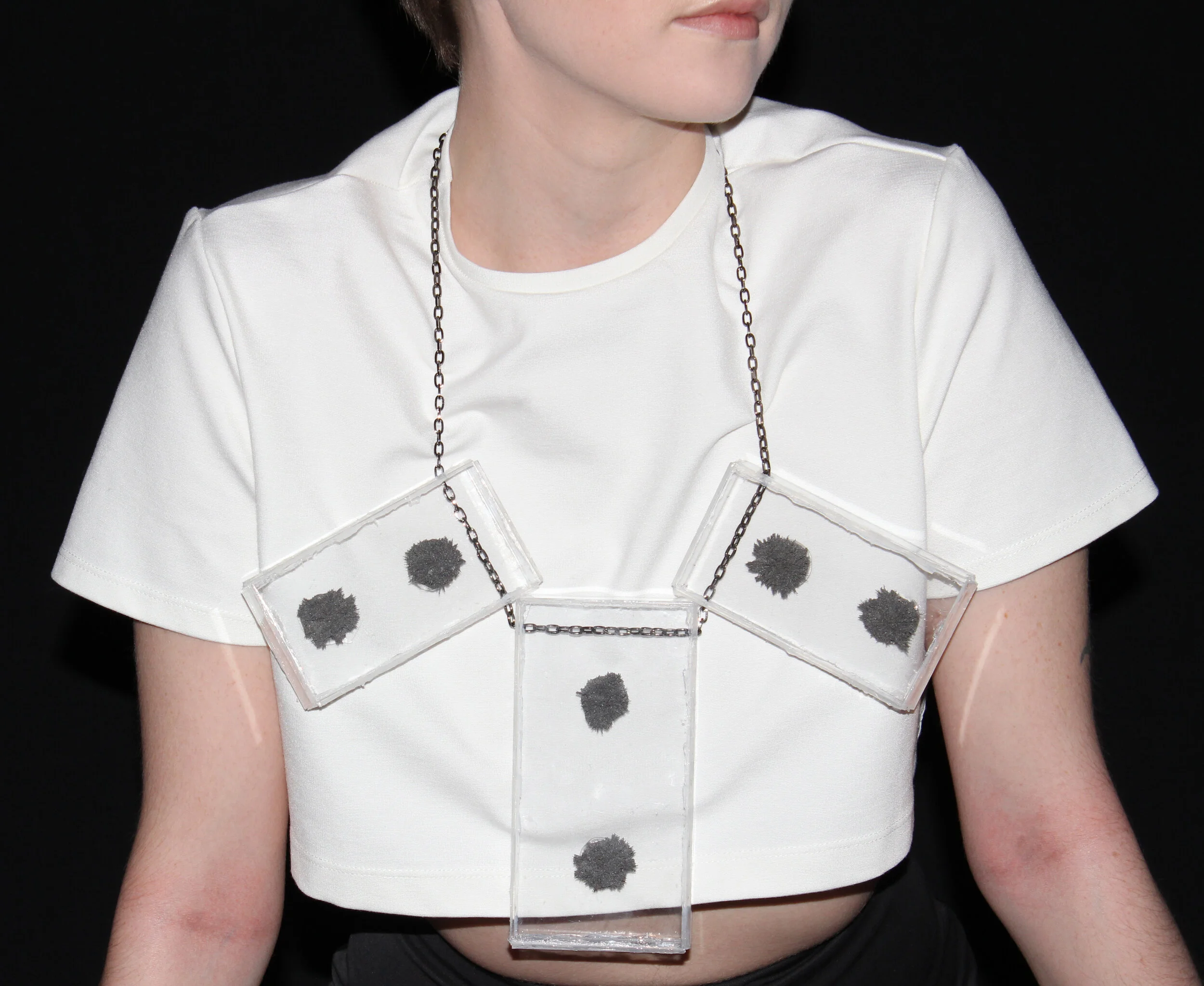 Original necklace design: necklace is made of magnets when they react to iron ores. Each box is is made out of acrylic.
